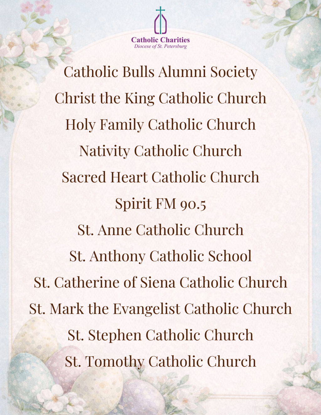 An annual fundraising event by Catholic Charities Diocese of St. Petersburg, that is being expanded this year to serve more children of Catholic Charities client families. We are collecting Easter Basket supplies, to make Easter Baskets for groups of our low-income clients whose children would otherwise not be able to enjoy this secular aspect of Easter:
